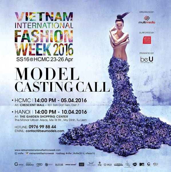 Vietnam International Fashion Week sẽ chọn lựa những gương mặt người mẫu tài năng nhất vào ngày 05/04/2016 tại Crescent Mall - 101 Tôn Dật Tiên, Q.7, TP.HCM và ngày 10/04/2016 tại Phòng VIP, Trung tâm thương mại The Garden, Khu đô thị The Manor, Mỹ Đình, Hà Nội. Đây là cơ hội cho những người mẫu trẻ được đắm mình trong đam mê và khoác lên những bộ trang phục đẳng cấp nhất từ các nhà thiết kế nổi tiếng trong và ngoài nước.