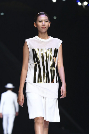 Những đường da nhũ đồng đính trên áo không tay cũng là điểm nhấn giữa tổng thể chung đơn giản và thanh lịch. Tinh thần phi giới tính (unisex) toát lên khá rõ ràng với sự tham gia của các mẫu nữ trong phần diễn.
