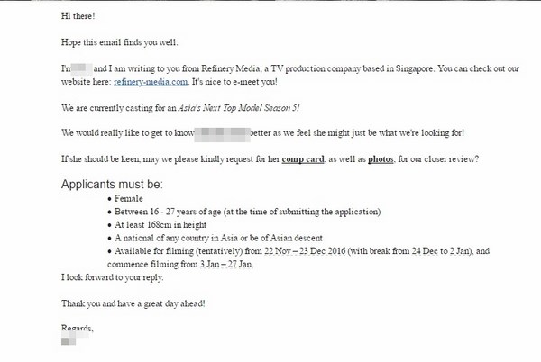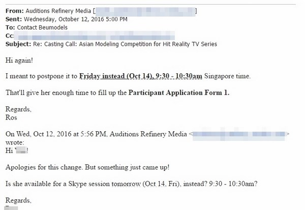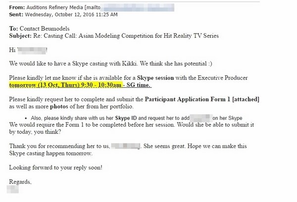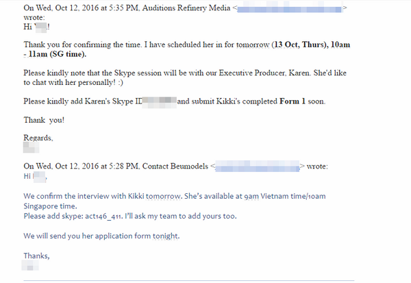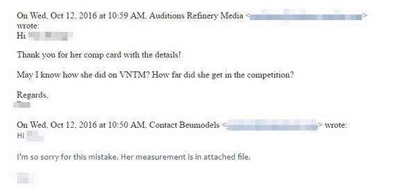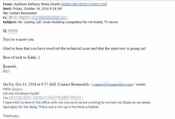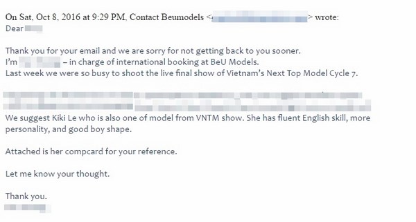 Sau đây là toàn bộ những email trao đổi giữa BeU Models với đại diện Nhà sản xuất Asia’s Next Top Model về việc đề cử quyết định lựa chọn Kikki Lê tham gia cuộc thi này: