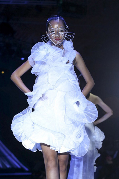 Thanh Nga lấy cảm hứng từ chiếc lá rẻ quạt đến với khán giả quê nhà. Chất liệu voan, lụa organza được phù phép, biến hóa trở thành những nếp xếp cầu kỳ, mang đến cảm hứng về thời trang vị lai. Phần chân váy tạo nên sự chuyển động diệu kỳ trên mỗi bước đi của người mẫu.