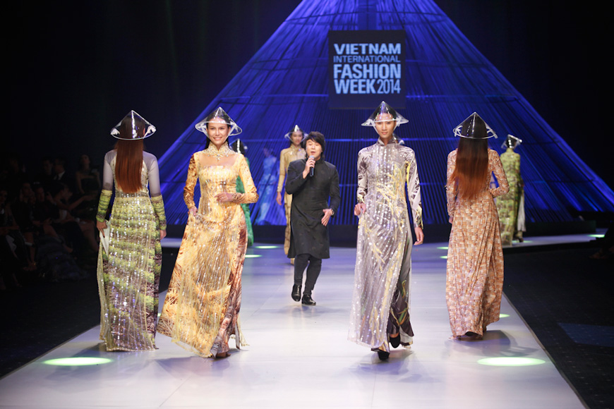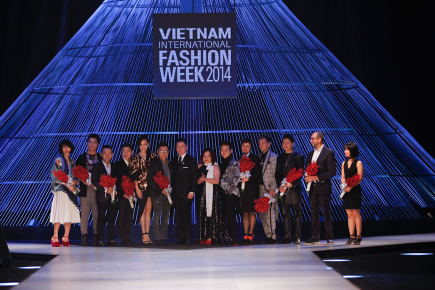Bà Quỳnh Trang (khăn trắng) và các NTK Việt Nam - quốc tế tham dự tuần lễ thời trang quốc tế Việt Nam 2014