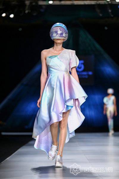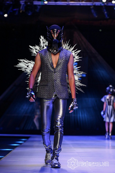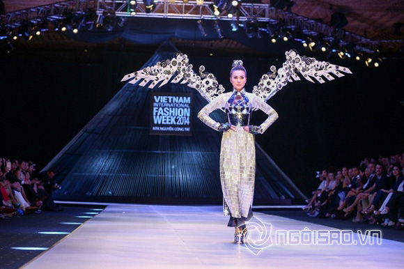 Trong một thiết kế áo dài được gắn đôi cánh sau lưng là những bánh xe hình răng cưa độc đáo, Thanh Hằng tự tin sải bước trên sàn catwalk. Tuy nhiên điểm gây chú ý trên thân áo cô mặc chính là phần “áo giáp” sáng chói trước ngực phản chiếu ánh nhìn của người xem.