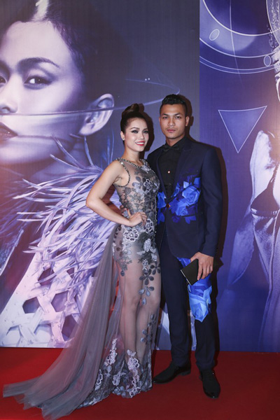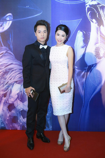 Vợ chồng Đăng Khôi đẹp đôi tại sự kiện. Vợ Đăng Khôi rất xinh đẹp và thanh lịch trong chiếc đầm trắng họa tiết chần điểm hạt.