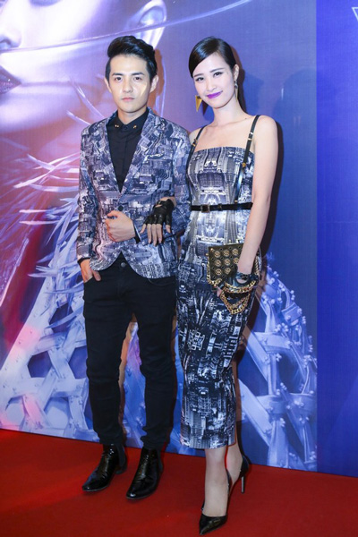 Cặp đôi Ông Cao Thắng - Đông Nhi diện đồ rất ton-sur-ton. Trong khi Đông Nhi gợi cảm và cá tính với váy quây midi tôn dáng kèm dây đai thì Ông Cao Thắng lại bảnh bao với blazer cùng họa tiết và quần jeans đen.